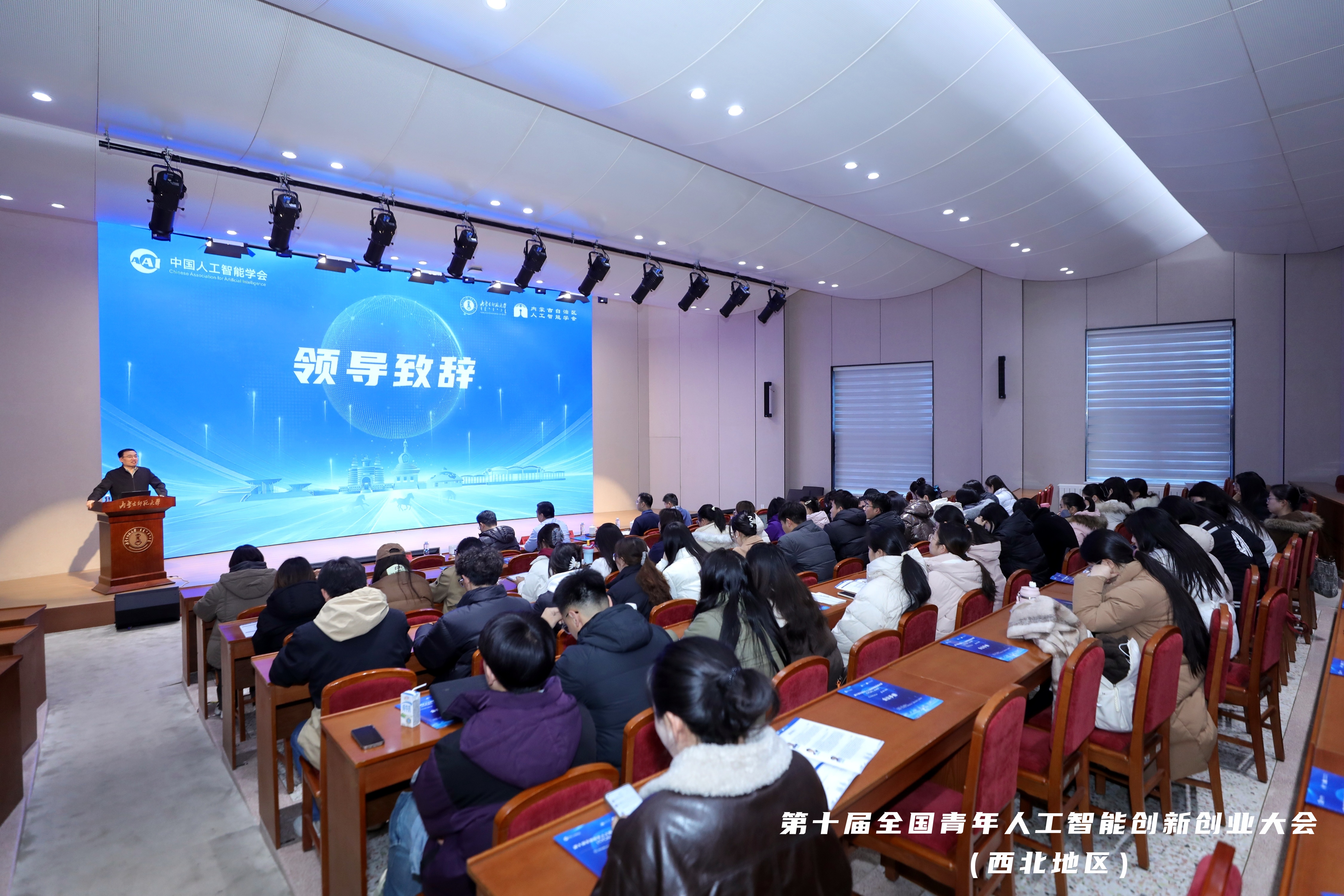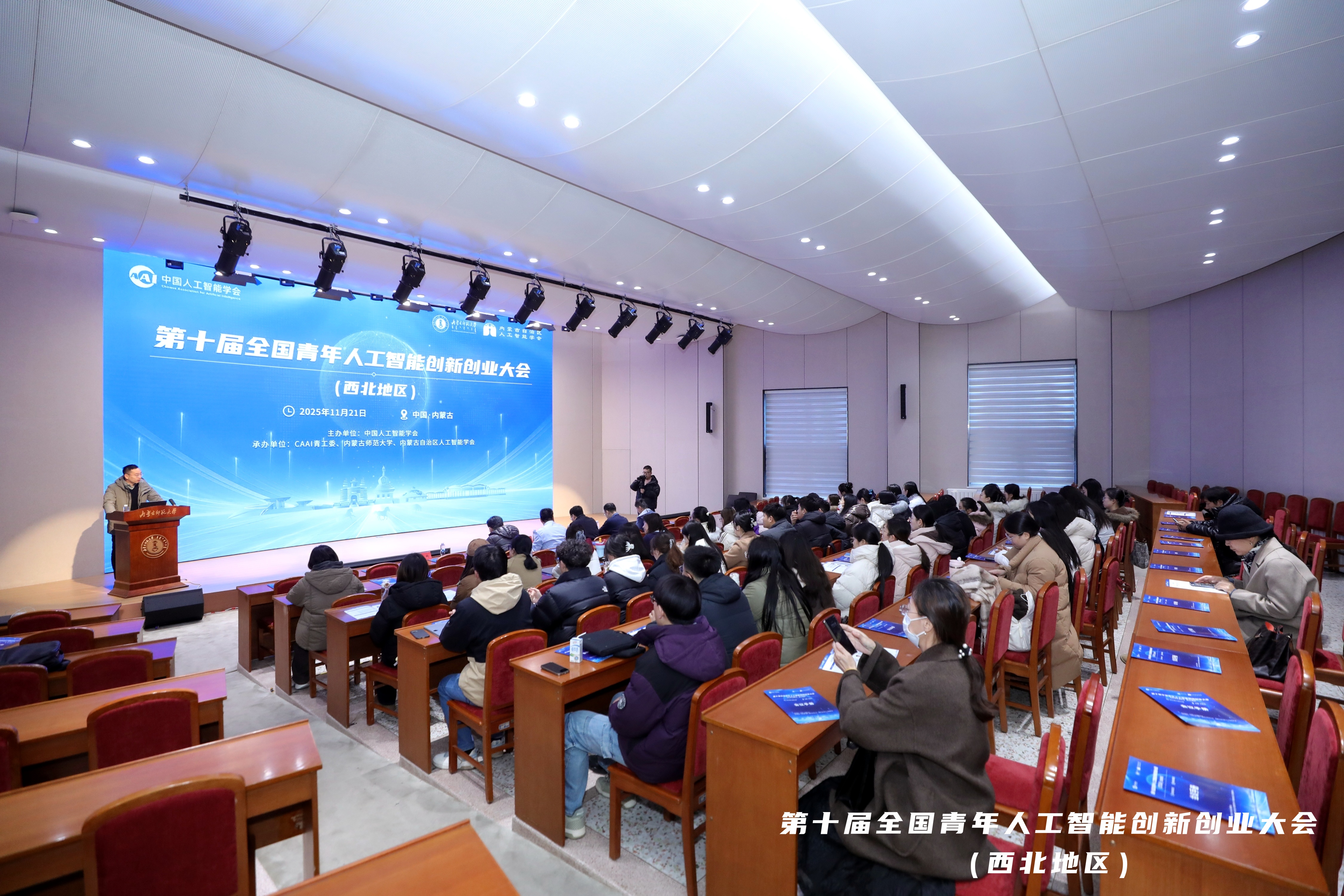 2025年11月21日,⼗届国⻘年⼯智创新创业⼤会西北赛区决赛在内蒙古师范⼤学赛罕校区举⾏。此次赛事由中国⼈⼯智能学会主办,内蒙古师范⼤学与内蒙古⾃治区⼈⼯智能学会联合承办。该⼤会⾃年创办以来已成功举办⼗届,⾯向全国⾼校、科研机构、企业等单位汇聚优质创新创业资源,重点聚焦战略新兴产业与未来产业,助⼒推动技术创新突破与产业深度融合。⼤会通过搭建技术交流平台、开展创业能⼒培训、对接资本资源等服务,强化科研⼈员的成果转化能⼒,助⼒科技成果⾼效市场化、产业化。