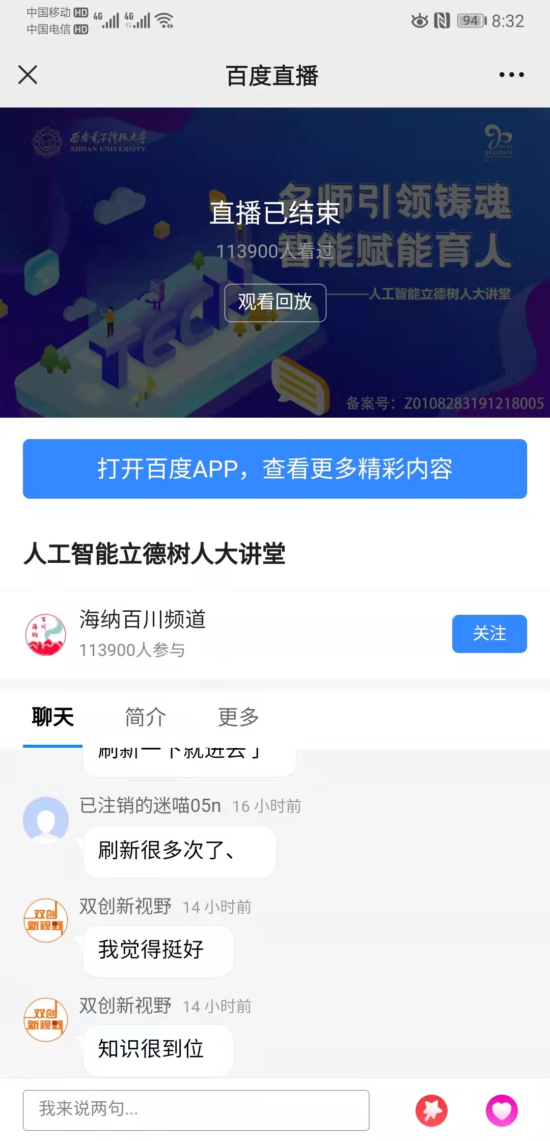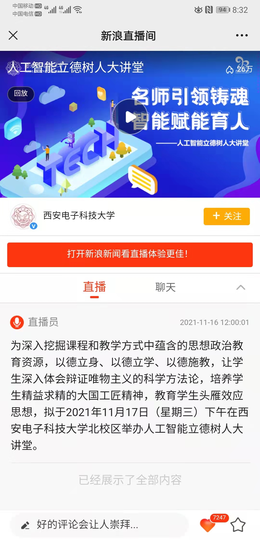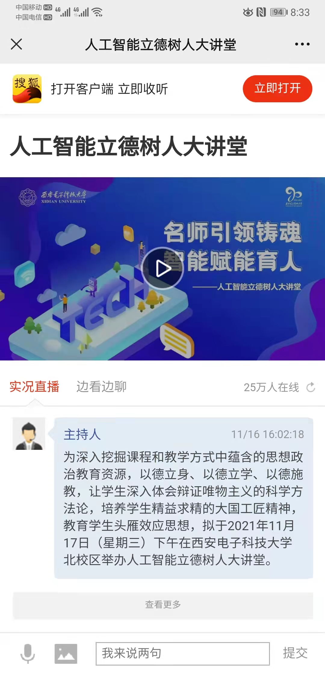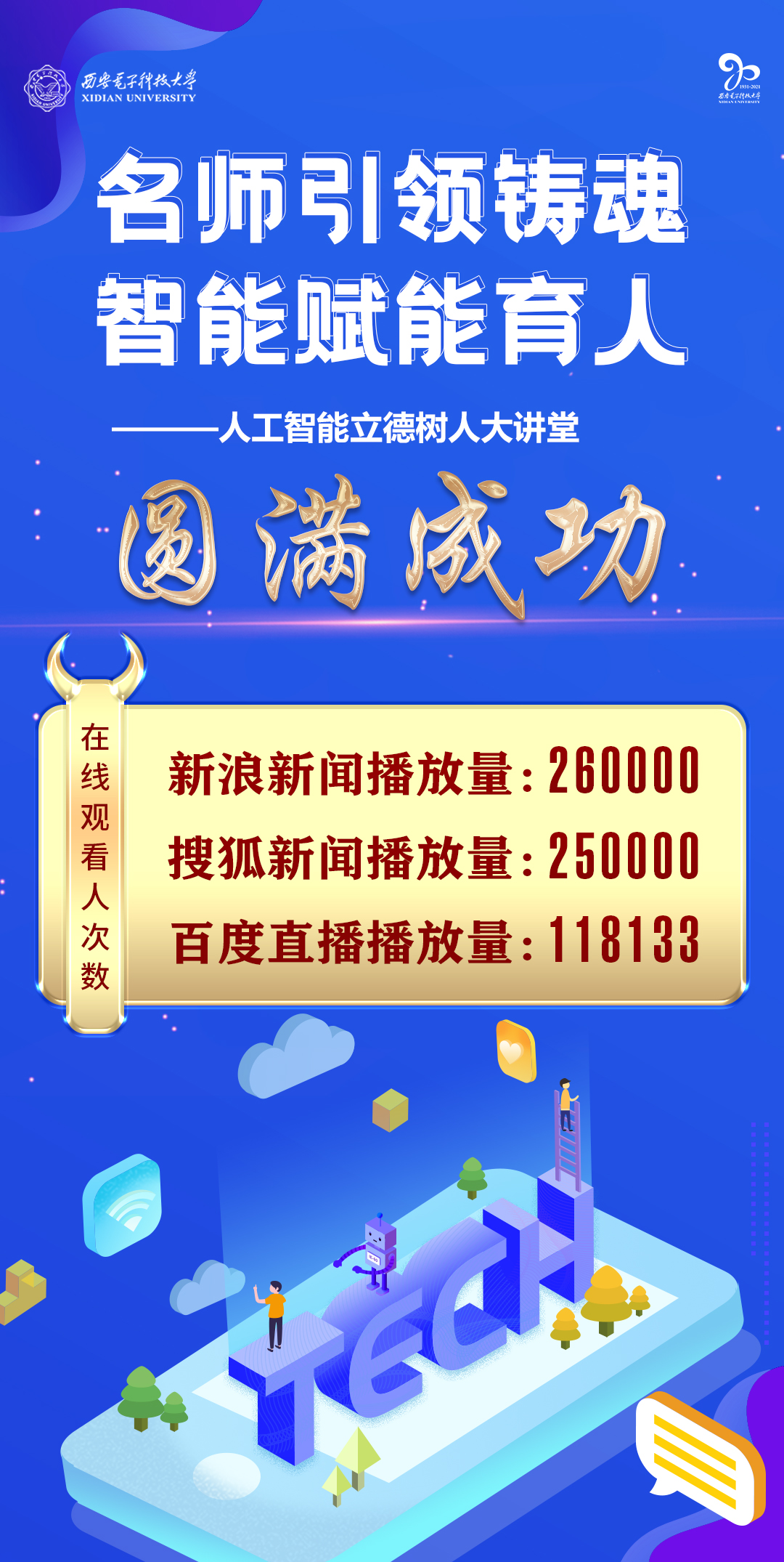 2021年11⽉17⽇,西安电⼦科技⼤学北校区举办⼈⼯智能⽴德树⼈⼤讲堂,线上同步进⾏直播,吸引超68万⼈次在线观看。