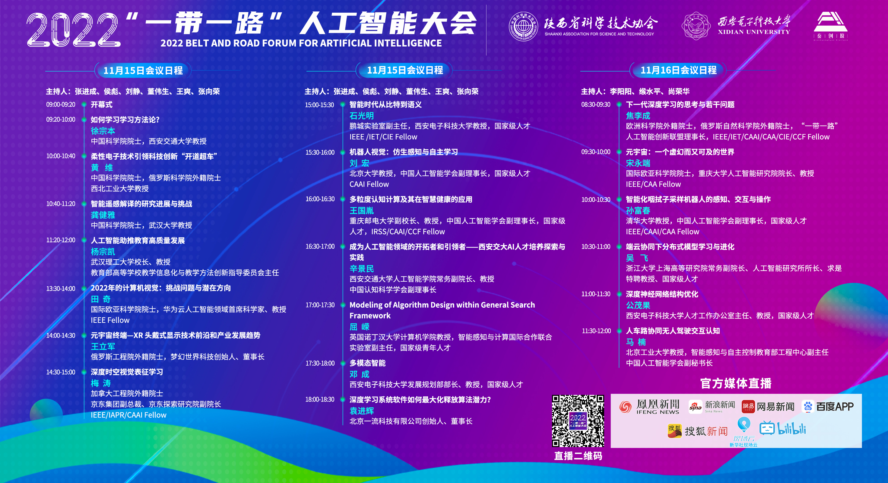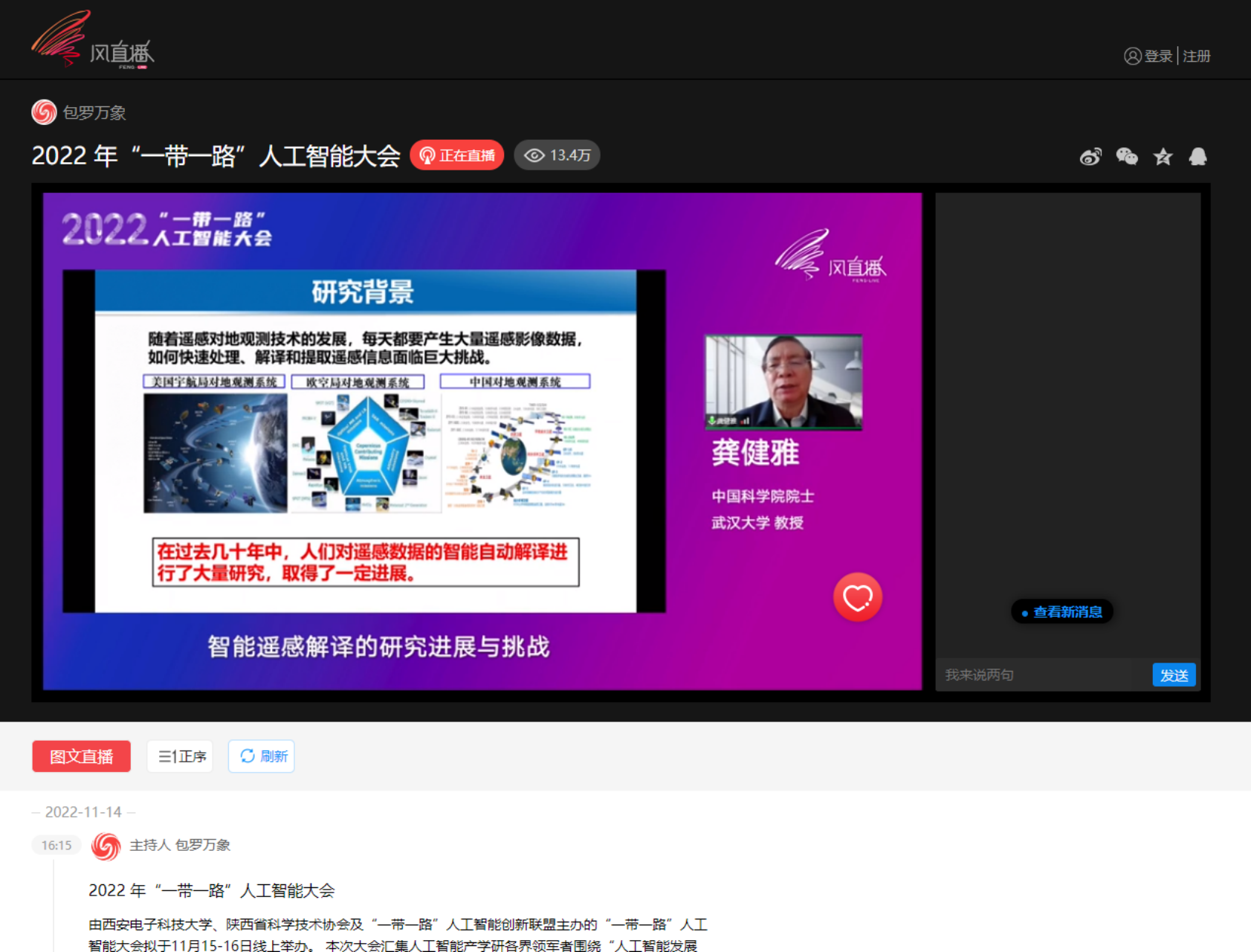 2022年11月15日-16日“一带一路”人工智能大会在线上成功举办,20位院士专家、领域权威学者以及业界精英等相聚一堂,围绕“人工智能发展的前沿与挑战” 、“人工智能交叉领域学科建设”、“人工智能开源基座与产业应用”的主题进行深入探讨,激荡思想火花,启迪智能未来。大会直播共吸引了超过330万人次观看。